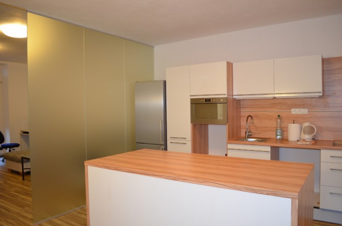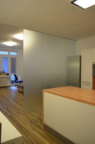 Provedli jsme kompletní rekonstrukci a realizaci interiérů v brněnském bytě na ulici Dřevařská. Při rekonstrukci byly provedeny dispoziční změny bytu, byly položeny nové podlahy, byla provedena nová elektroinstalace, byly dodány nové dveře. Dále naše společnost obstarala veškeré vestavné spotřebiče a vyhotovila zakázkový nábytek. Díky skleněné příčce se prostor kuchyně prosvětlil a atmosféru dotváří grafika u jídelního stolu. Můžete si prohlédnout fotografie z realizace.